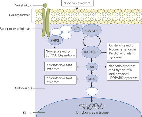 Costellos syndrom viser mange fenotypiske likhetstrekk med Noonans syndrom, men pasientene har økt risiko for å utvikle kreft. Dette førte til oppdagelsen av at syndromet skyldes medfødte mutasjoner i HRAS (9). Store materialer av syndrompasienter ble deretter systematisk undersøkt for mutasjoner i andre gener i MAPK-signalveien. Slik fant man at Noonans syndrom kan forårsakes av medfødte mutasjoner i genene KRAS, RAF1 og SOS1, mens kardiofaciokutant syndrom skyldes mutasjoner i KRAS, BRAF eller i gener som koder for MEK-proteiner (fig 1).