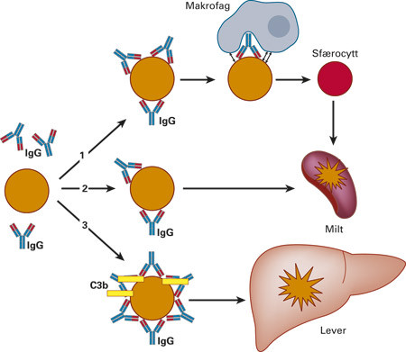 Etter binding av autoantistoff til celleoverflaten kan antigen-antistoff-komplekset binde komplement, men erytrocyttene blir vanligvis for tynt dekt med immunglobulin til å utøse full aktivering av komplementkaskaden. Figur 1 viser hvordan opsoniseringen fører til ekstravasal hemolyse (18).