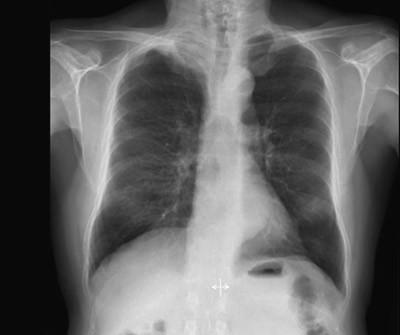 Røntgen thorax (fig 1) tatt rutinemessig ved innkomst viste en oppfylling i høyre lungetopp. CT collum/thorax/abdomen avdekket en ca. 6 cm stor svulst apikalt i høyre lunge (fig 2a, b). Det var ingen tegn til patologisk forstørrede lymfeknuter eller andre svulster. Bildene viste i tillegg emfysemforandringer og et stort abdominalt aortaaneurisme.