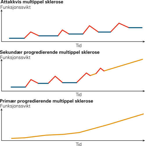 I 80–90 % av tilfellene debuterer sykdommen som attakkvis multippel sklerose (relapsing-remitting multiple sclerosis, RRMS), karakterisert ved gjentatte subakutte attakker med utfall fra sentralnervesystemet – med påfølgende varierende grad av remisjon (fig 1). Over tid vil en økende andel av pasientene utvikle sekundær progredierende multippel sklerose, etter 15–20 år ca. 50 %, med jevn progrediering, eventuelt med stabile faser, men uten remisjon (1, 2) . Primær progredierende multippel sklerose (10–20 %) kjennetegnes av jevnt utviklende symptomer og utfall fra sentralnervesystemet, gjerne med stabile faser, men uten remisjon (fig 1).