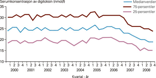 Mediankonsentrasjonen av digitoksin lå stabilt på ca. 25 nmol/l til og med 2006 (fig 1). Fra 2007 sank mediankonsentrasjonen gradvis og var 19 nmol/l ved utgangen av 2008. Verdiene for 25- og 75-persentilene viste en tilsvarende tendens (fig 1). Andelen prøver med konsentrasjoner over 33 nmol/l, dvs. øvre grense i det gamle referanseområdet, varierte mellom 10 % og 20 % frem til utgangen av 2006. I de fire kvartalene i 2008, etter at øvre grense i referanseområdet var blitt redusert til 15 nmol/l, var andelen prøver med konsentrasjoner over referanseområdet økt til henholdsvis 69, 65, 66 og 67 %.