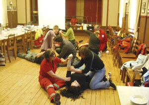 Samme år valgte vi å organisere det lokale helsepersonellet i Bjarkøy kommune i en egen «akuttgruppe» rundt denne utstyrs- og opplæringspakken, med sykepleiere fra pleie- og omsorgstjenesten, legesekretær, helsesøster og kommuneleger. Gruppen gjennomfører intern opplæring og praktiske fellesøvelser to timer hver sjette uke (fig 1). Fra 2006 har også lokalt ambulansepersonell deltatt i øvelsene.