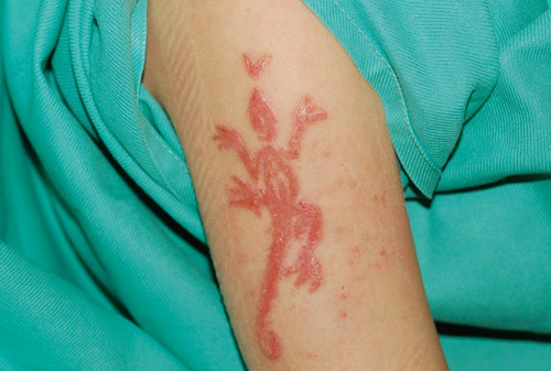 En seks år gammel gutt fikk en hennatatovering på høyre arm da han var på ferie i Tyrkia. Etter 1 – 2 uker oppsto det kløe, rødme og hevelse på tatoveringsstedet. Han ble behandlet med kortisonkrem av sin fastlege. Etter tre uker ble gutten undersøkt ved en hudavdeling. Det ble da funnet en erytematøs, væskende lesjon på tatoveringsstedet (fig 1). På huden rundt var det et makulopapuløst eksantem. Det ble gitt behandling med gruppe III-kortikosteroidkrem (mometasonfuroat).
