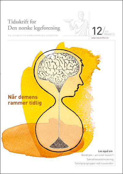 Forsidebildet FORSIDEN () sporsmal_grey_rgb Artikkel Illustrasjon © Randi Matland, Supernøtt Popsløyd Så sterkt assosieres demens med gamle mennesker at det latinske ordet for gammel – senil – på folkemunne har kommet til å betegne den demenssyke. Når demens rammer i ung alder, kan det være med andre debutsymptomer og raskere sykdomsforløp enn hos eldre. Tidlig diagnostikk kan være viktig. Derfor må vi huske at også unge kan bli demente. Kommentarer ( 0 ) Dette kommentarfeltet modereres, men kommentarer blir ikke redaksjonelt behandlet ut over å sikre at de følger retningslinjer for vårt kommentarfelt. Denne artikkelen ble publisert for mer enn 12 måneder siden, og vi har derfor stengt for nye kommentarer. Publisert: 17. juni 2011 Utgave 12, 17. juni 2011 Tidsskr Nor Legeforen 17. juni 2011 131 : 1171 Publisert: 17. juni 2011 Utgave 12, 17. juni 2011 Tidsskr Nor Legeforen 2011 131 : 1171 PDF Får du ikke vist PDF-filen eller vil lagre filen, kan du høyreklikke på PDF-ikonet. Velg «Lagre mål/fil som..» og hent så opp PDF-filen i for eksempel Acrobat Reader. Skriv ut Anbefalte artikler