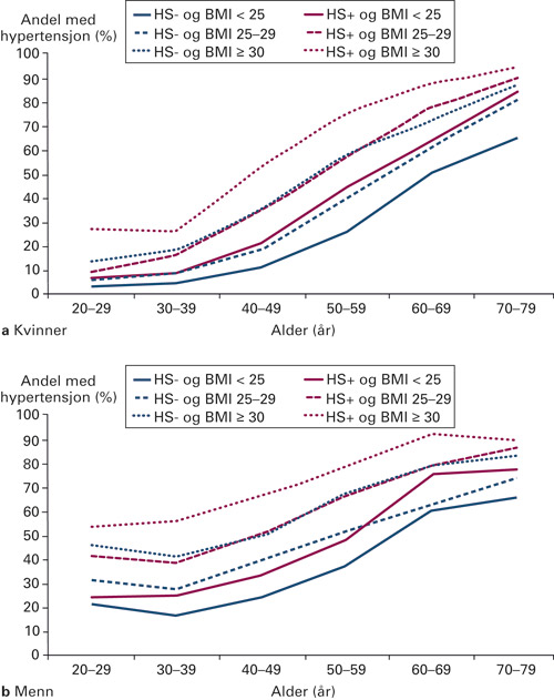 Overvekt, fedme og hypertensjon i slekten er hyppig forekommende og sterkt assosiert med økt blodtrykksnivå og forekomst av hypertensjon. Assosiasjonen er mest uttalt hos kvinner. Det er vel kjent at overvekt og spesielt fedme er assosiert med forhøyet blodtrykk og økt risiko for død (12, 13), likeledes assosiasjonen mellom hypertensjon i slekten og blodtrykksnivå (14). Vårt bidrag er å kvantitere disse sammenhengene for begge kjønn og i ulike aldersgrupper. Effekten av fedme var ca. 10 mm Hg og 7 mm Hg høyere blodtrykk hos henholdsvis kvinner og menn. Dette kan stemme overens med at vektreduksjon er angitt å senke systolisk og diastolisk blodtrykk med 1 mm Hg per kilo (15). Til sammenlikning er den blodtrykksreduserende effekten av ett antihypertensivum i gjennomsnitt ca. 10 mm Hg (16).