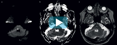 En tidligere frisk mann i 80-årene utviklet akutte synsproblemer med dobbeltsyn i alle blikkretninger. Han følte seg ustø og kastet opp flere ganger. Ved innleggelse i nevrologisk avdeling ble det påvist en kompleks øyemotilitetsforstyrrelse med konjugert blikkparese mot høyre og internukleær oftalmoplegi mot venstre (video). CT caput ved innkomst viste kun lette hypodense forandringer, forenlig med kronisk iskemi. MR med diffusjonsvektet serie viser følgende: a) hyperintenst signal (pil) dorsalt i hjernestammen på høyre side (summasjonsbilde), b) lavt signal i samme lesjon på ADC-kartet (Apparent Diffusion Coefficient) (pil) og c) lett hyperintenst signal på T2-vektet serie (pil). Funnet er forenlig med cytotoksisk ødem og akutt hjernestammeinfarkt i den paramediane pontine retikulærsubstansen. Dette kunne forklare pasientens symptomer.
