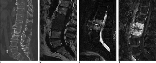 En mann i 70-årene ble lagt inn på Medisinsk avdeling med sepsis forårsaket av Streptococcus pneumoniae og ryggsmerter, tolket som lungebetennelse. Han ble initialt behandlet med intravenøs penicillin og gentamicin og utskrevet med perorale antibiotika. En uke senere ble han på ny innlagt med økende ryggsmerter, feber og stigende infeksjonsparametre. Det var ingen nevrologiske utfall. På bakgrunn av sykehistorien og sparsomme funn ved auskultasjon og røntgen thorax, ble CT columna, så MR rekvirert. CT viste uregelmessig kontur av nedre og øvre dekkplater i L2/L3, subkondrale destruksjoner og nedsatt skivehøyde (a). På standard T1-vektede (b) og STIR (short τ inversion recovery)-bilder på MR (c) ses utbredt ødem i L2, L3 og i det paravertebrale bløtvevet. På serien med kontrast med fettsuppresjon ses randkontrastoppladning i selve skiven (d). Disse funnene sammen med de kliniske funnene er forenlig med bakteriell spondylodiskitt.