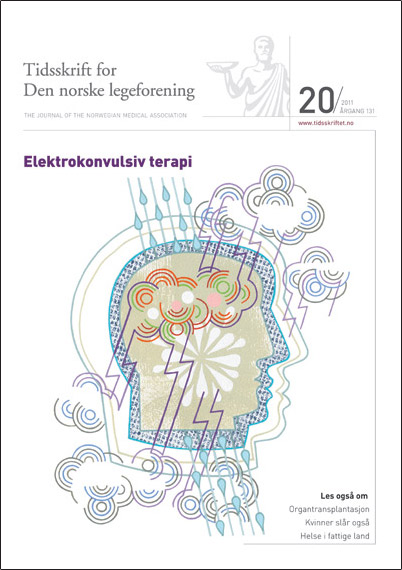 Forsidebildet FORSIDEN () sporsmal_grey_rgb Artikkel Illustrasjon © Thom Sevalrud Den menneskelige hjerne er den mest komplekse struktur vi kjenner til i det observerbare univers. Uspesifikt å sende strøm gjennom den virker ikke umiddelbart som noen god idé. Allikevel regnes elektrokonvulsiv terapi som sikker og effektiv behandling av alvorlig depresjon. Kommentarer ( 0 ) Dette kommentarfeltet modereres, men kommentarer blir ikke redaksjonelt behandlet ut over å sikre at de følger retningslinjer for vårt kommentarfelt. Denne artikkelen ble publisert for mer enn 12 måneder siden, og vi har derfor stengt for nye kommentarer. Publisert: 18. oktober 2011 Utgave 20, 18. oktober 2011 Tidsskr Nor Legeforen 18. oktober 2011 131 : 1975 Publisert: 18. oktober 2011 Utgave 20, 18. oktober 2011 Tidsskr Nor Legeforen 2011 131 : 1975 PDF Får du ikke vist PDF-filen eller vil lagre filen, kan du høyreklikke på PDF-ikonet. Velg «Lagre mål/fil som..» og hent så opp PDF-filen i for eksempel Acrobat Reader. Skriv ut Anbefalte artikler