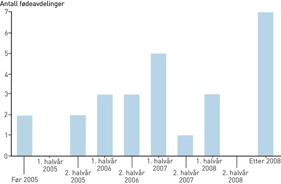 12 av 39 avdelinger oppga at det hadde vært liten eller ingen endring i praksis. Ved de andre avdelingene ble det angitt noe, stor eller fullstendig endring i praksis i løpet av de siste årene (tab 1). Flere av respondentene hadde vansker med å anslå tidspunktet for når eventuelle endringer fant sted, men nesten alle mente det hadde skjedd i løpet av de siste fem årene (fig 1). Samlet oppgir tilnærmet to tredeler av avdelingene at det har vært endring av praksis i løpet av de siste fem årene.