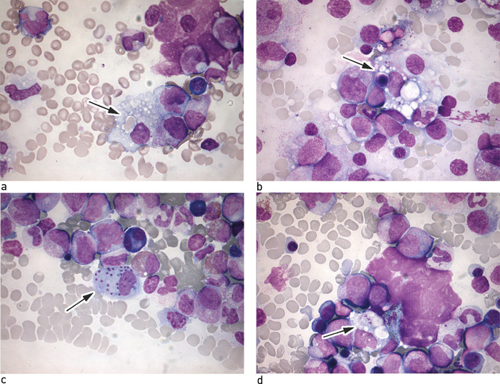 Dagen etter innkomst ble det i narkose utført beinmargsaspirasjon og -biopsi. Beinmargen var cellerik og viste en livlig trilineær hematopoese uten unormal opphopning av umodne celler. Immunfenotypisk var det heller ingen holdepunkter for akutt leukemi. I beinmargen ble det sett monocytter/makrofager med inklusjoner av erytrocytter og kjerneholdige celler samt inklusjoner som vi først ikke kunne identifisere (fig 1).