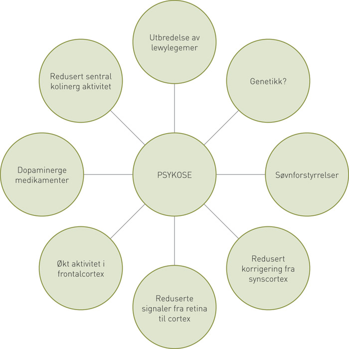 Årsakene til psykose ved denne sykdommen er ikke endelig klarlagt, men involverer et komplekst samspill mellom flere nevrodegenerative endringer og medikamenter (fig 1). Vi vil i det følgende fremheve de mest kjente av disse.