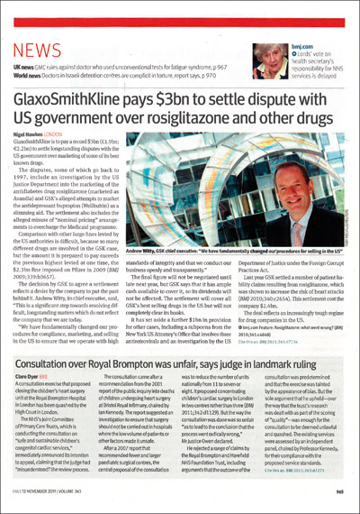 GlaxoSmithKline (GSK) godtok i november 2011 et forlik med den amerikanske regjeringen på 3 milliarder dollar (18 milliarder kroner) for ulovlig markedsføring av en rekke medisiner, inkludert Avandia (1). Denne saken likner mye på tilsvarende bøtelegging (0,5 – 3 milliarder dollar) av Pfizer, Lilly, Novartis, Merck og AstraZeneca de siste par år i USA (2). Hva er det som foregår, og hvorfor godtar verdens største legemiddelfirmaer slike gigantbøter?