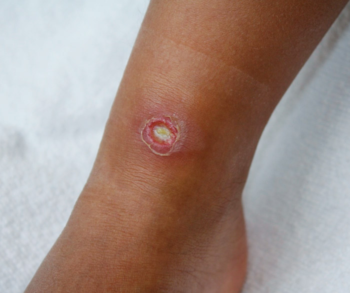 De hadde lekt ute i høyt gress og vært i kontakt med hunder. Hvert av barna hadde én hudlesjon; henholdsvis på benet (til venstre), i hodebunnen og foran øret (til høyre). To av lesjonene er avbildet 10 – 14 dager etter symptomdebut. Den ene har en svart sentral skorpe, på den andre har skorpen allerede falt av.