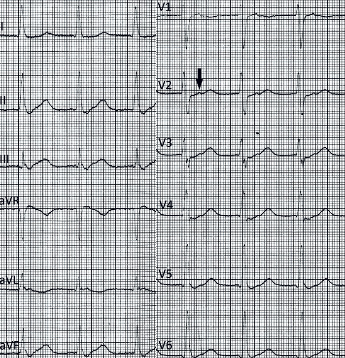 Sykehistorien ga nå mistanke om at pasienten kunne ha anfall med supraventrikulær takykardi med økende hyppighet og varighet, som i kombinasjon med infarktsekvelet ga henne hjertesvikt, Cheyne-Stokes’ respirasjon og delirium. Uhensiktsmessig behandling med psykofarmaka forverret respirasjonen, som igjen forverret angsten og sammen med midlenes antikolinerge effekter forverret deliriet. Ved fornyet inspeksjon av EKG tatt ved den aktuelle innleggelsen, ble det klart at også dette viste retrograde P-bølger.