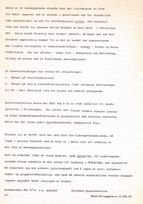 Jeg må bare beklage at vårt materiale ikke er godt nok undersøkt til at vi kan angi den prosentvise fordeling av forskjellige typer fremmedlegemer, og heller ikke hvilken type som har økt mest i de siste 20 årene. Dette vil vi ta sikte på å utrede i den kommende 20 års periode. Vi vil da også ta snitt fra begge sprogsentrene og hypothalamus.