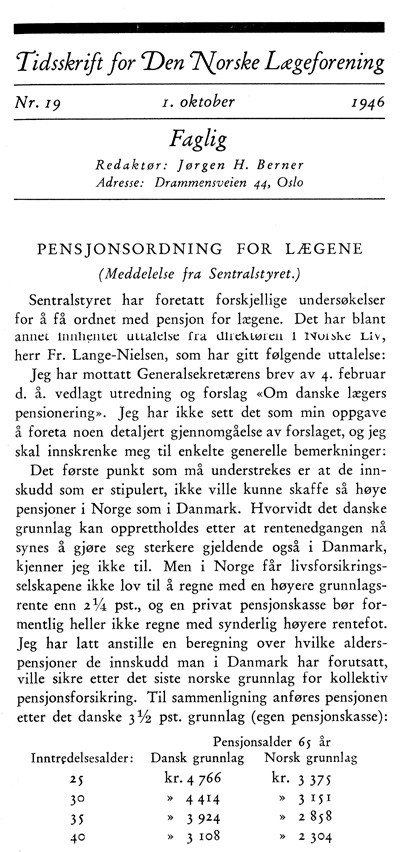 Tidligere i Tidsskriftet Til kamp for pensjon Marit Fjellhaug Nylund Om forfatteren Se alle artikler Marit Fjellhaug Nylund Email: marit.nylund@legeforeningen.no Tidsskriftet () sporsmal_grey_rgb Artikkel Landsstyremøtet står for døren. Her gjør man det man kan for å sikre gode forhold for leger. Vi har gjort et dykk i arkivet og funnet en meddelelse fra sentralstyret fra 1946 (Tidsskr Nor Lægeforen 1946; 66: 625). Da var det pensjonsordning man ønsket å få på plass. Kommentarer ( 0 ) Dette kommentarfeltet modereres, men kommentarer blir ikke redaksjonelt behandlet ut over å sikre at de følger retningslinjer for vårt kommentarfelt. Denne artikkelen ble publisert for mer enn 12 måneder siden, og vi har derfor stengt for nye kommentarer. Publisert: 15. mai 2012 Utgave 9, 15. mai 2012 Tidsskr Nor Legeforen 15. mai 2012 doi: 10.4045/tidsskr.12.0404 PlumX 132 : 1130 Publisert: 15. mai 2012 Utgave 9, 15. mai 2012 Tidsskr Nor Legeforen 2012 132 : 1130 doi: 10.4045/tidsskr.12.0404 Plum Print visual indicator of research metrics PlumX Metrics PDF Får du ikke vist PDF-filen eller vil lagre filen, kan du høyreklikke på PDF-ikonet. Velg «Lagre mål/fil som..» og hent så opp PDF-filen i for eksempel Acrobat Reader. Skriv ut Anbefalte artikler
