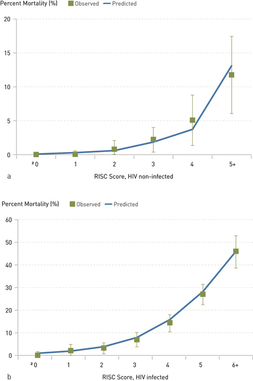 Basert på funn hos 4 148 hospitaliserte barn under to år med pneumoni har en forskergruppe utviklet det de kaller Respiratory Index of Severity in Children (RISC)-skår (2) . De definerte en indeks for hivpositive barn, som i dette tallmaterialet fra Sør-Afrika hadde dødelighet på hele 17,6 %; og en annen indeks for hivnegative, som hadde samlet dødelighet på 1,3 %. Skåringssystemet baserer seg på fem variabler for hivnegative (oksygenmetning, inndragninger, pipelyder (godt prognostisk tegn), avvisning av mat, og ernæringsstatus) og seks variabler for hivpositive (oksygenmetning, inndragninger, pipelyder, avvisning av mat, alder, og hivstadium). De forskjellige variablene er vektet ut ifra prediktiv verdi, slik at maksimal RISC-skår blir 6 og 7 poeng for henholdsvis hivnegative og -positive. Særlig har hypoksemi stor prediktiv verdi, slik at SpO₂ < 90 % gir hele 3 risikopoeng.