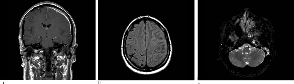 Nevroradiologisk undersøkelse spiller en sentral rolle i evalueringen av sykdommen. Imidlertid kan det ta to år før det tilkommer signifikante bildediagnostiske funn (19). CT-bilder avslører hyperintense durale lesjoner med homogen kontrastladning, men i enkelte tilfeller, for eksempel ved lite uttalt dural fortykkelse, påvises det ikke unormale funn (18). MR-undersøkelse er den beste metoden til å identifisere lesjonene og utelukke andre sykdomsprosesser. MR-funn er karakteristiske og viser forskjellige grader av lesjonens inflammatoriske mønster (5, 8). T1-vektede bilder viser isodens eller hypodens fortykket dura (6, 8, 9, 13) med intens forsterkning etter injeksjon av paramagnetisk kontrastmiddel, grunnet inflammatorisk reaksjon i pakymeningene. Dura mater opptrer hypointenst på T2-vektede bilder, i enkelte tilfeller omgitt av en hyperintens rand av lesjonen (8, 9, 13, 19). Det sentrale hypodense området er relatert til en fibrøs prosess, mens den perifere hyperintensiteten skyldes aktiv inflammatorisk reaksjon (9, 13). Bruk av gadolinium er viktig for å bedømme den meningeale ladningen, som kan brukes til å skille mellom pakymeningitt og leptomeningitt. MR-funn kan også gi en indikasjon på det kliniske forløpet. Diffus og homogen fortykkelse av dura og godt definerte T2-vektede randsoner er assosiert med kort klinisk forløp og god prognose. Hypodens hypertrofisk hjernehinne på T2-vektede serier, uten hyperdens rand og med dishomogen kontrastladning er forbundet med kroniske tilstander og ugunstig prognose (8).