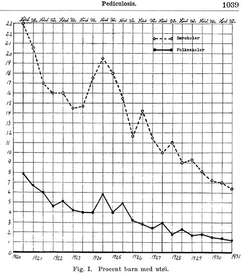 Figuren gir et godt inntrykk av den store fremgang i renslighet fra 1920 til nu. Den viser hyppigheten av utøi blandt alle barn ved de to skolearter, særskole og folkeskole hver for sig. Vi ser, at blandt folkeskolebarnene er utøiprocenten sunket fra nesten 8 pct. i 1920 (24 768 elever) til litt over 1 pct. i 1930 (21 644 elever). Blandt særskolebarnene ligger utøiprocenten adskillig høiere som rimelig er; men også her har det vært et betydelig fall, nemlig fra 23 pct. i 1920 (541 elever) til 7 pct. i 1930 (636 elever). Vi legger merke til at fallet ikke er jevnt. I 1924 er der en stigning, og da materialet er meget stort, gjennemsnittlig ca. 23 000 folkeskolebarn og ca. 600 særskolebarn, er sikkert denne stigning reel. Lusene er som bekjent meget stasjonære parasitter, og konservator Natvig finner det høist usannsynlig at spesielle entomologiske eller klimatiske forhold kan spille nogen rolle. Årsaken må sikkert søkes i en dårligere renslighet og en slettere hygiene i det hele. Riktignok var høsten 1923 begynnelsen til en inflasjonsperiode som varte utover1924; men i samme grad som den norske krones kjøpekraft sank, steg lønningene (oplysninger fra Oslo statistiske kontor). Imidlertid viste arbeidsløsheten sig stigende, og det er vel rimelig at det er den større arbeidsløshet med dårligere økonomi, trangere boligforhold og lignende som bevirket stigningen i utøiprocenten.