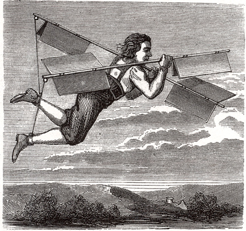 En måte å lykkes på er å legge scenarioet såpass langt inn i fremtiden at alle har glemt spådommen i god tid før den viser seg å være helt gal. Det er for eksempel neppe noen av Tidsskriftets lesere som fremdeles husker André Lütkens spådom fra 1878 om luftfartens muligheter. I sitt sjubindsverk Opfindelsernes Bog beriket han samtiden med følgende visjon (fig 1) (2): «Medens det ikke vil være muligt for mennesket at heve sig fra Jorden ved Hjælp av sin egen Muskelkraft, vil der derimot ikke være noget absolut til Hinder for at dette kan ske ved Hjælp av mekanisk Kraft; derimot turde det være et stort Spørgsmaal, hvad der i det hele taget vilde være oppnaaet, selv om det lykkedes at fremstille en virkelig brugbar Flyvemaskine; (. . .) som Transportmiddel vilde den sikkert aldrig finde Andvendelse, trods de store Forhaabninger der knyttes til en vordende Flyvemaskine af de mange, der spilde Tid og Kræfter paa at løse dette utaknemmelige problem. Thi hvor mange vilde vel have Mod til at betro sig til et Befordringsmiddel af dette Slags, naar den rædelsfuldeste Død maatte synes vis, naar Maskineriet i Flyveapparatet kom det minste i Uorden og pludseligt nægtede at gjøre Tjeneste, medens man befandt sig i maaske Tusinder af Fod over Jordens Overflade.»