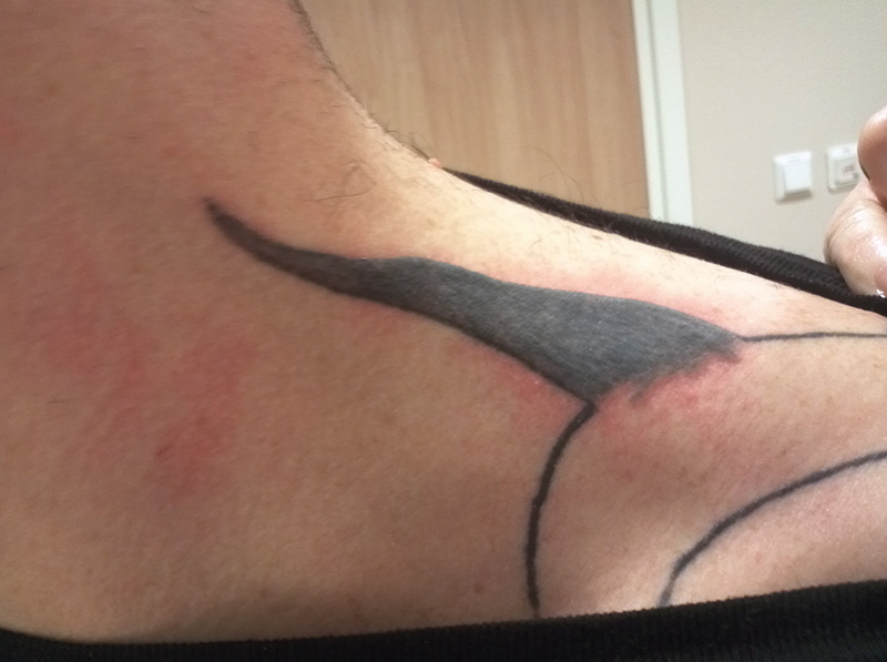 En mann i 30-årene med tallrike tatoveringer på truncus og ekstremiteter var til MR-undersøkelse (1,5 tesla). Inne i MR-maskinen (ryggleie, armene ned langs kroppen) fikk han umiddelbart intense, sviende smerter i huden på venstre skulderparti og albueregion. Han ble uten opphold hentet ut av maskinen, og det ble konstatert ca. 2 mm hevelse av to tatoveringer på skulder/albue samt rubor omkring (bildet). Det ble forsøkt å gjenta undersøkelsen med lakenisolasjon mellom venstre overekstremitet og truncus, men samme smerter oppsto. Pasienten hadde undergått nesten identisk undersøkelse uten problemer én måned tidligere, men da i mageleie med armene over hodet (utenfor MR-tunellen).