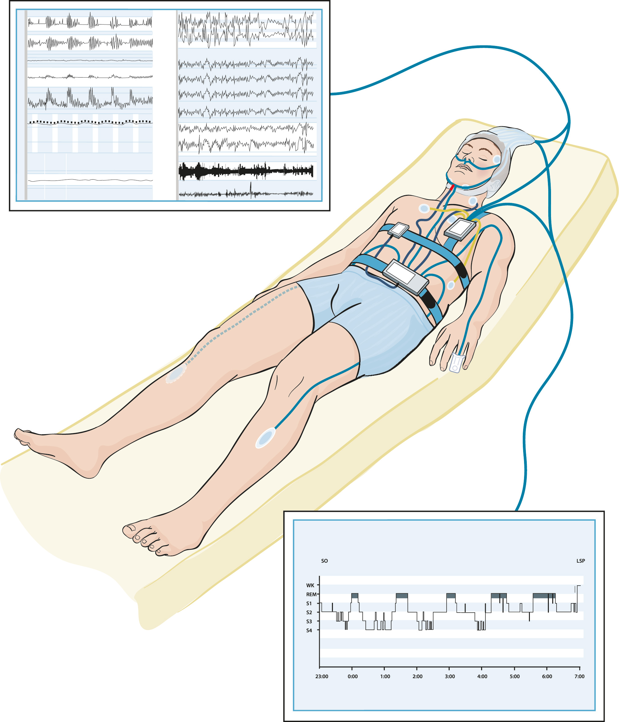 Polysomnografi er en helnatts undersøkelse av søvnen og er indisert ved en rekke søvnrelaterte problemstillinger (4). En polysomnografi er ressurs- og tidkrevende, og pasienten er tilkoblet avansert registreringsutstyr i mange timer (se illustrasjon). Undersøkelsen omfatter skåring av søvnstadiene på bakgrunn av EEG-aktivitet, øyebevegelser (elektrookulografi, EOG) og muskelspenning (elektromyografi, EMG). I tillegg registreres respirasjonsrelaterte variabler som luftstrøm gjennom nese og munn, snorkelyder, pustebevegelser over thorax og abdomen, oksygenmetning og elektrokardiografi (EKG). Dessuten registreres gjerne liggestilling og beinbevegelser (se illustrasjon). Avhengig av problemstillingen kan også andre målinger knyttes til registreringen, for eksempel trykkmålinger i oesophagus eller samtidig videofilming.