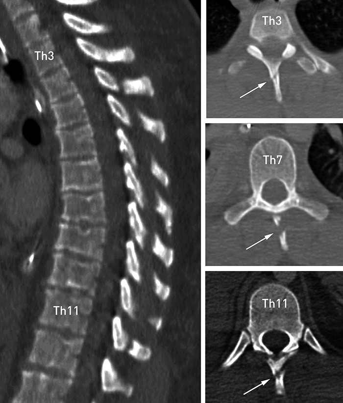 En mann i 20-årene pådro seg multiple skader i en snøscooterulykke. Ved undersøkelse i akuttmottaket hadde han 9 på Glasgow Coma Scale (GCS 9), sterke smerter og ømhet over torkalcolumna, men ingen fokale nevrologiske utfall. Traume-CT avdekket cerebrale kontusjonsblødninger, frakturer i skallebasis, skulderblad og ribbein og pneumothorax som følge av ribbeinsbruddene. I tillegg ble det påvist totalt ni isolerte frakturer av processus spinosi, også kalt «clay-shoveler’s fracture», fra Th3 til Th11. Klinisk undersøkelse og bildediagnostikk ga ikke mistanke om ytterligere skader i columna. Ryggfrakturene ble behandlet konservativt: smertestillende medikamenter og immobilisering i seks uker. Etter dette ble han fullt mobilisert og smertefri.