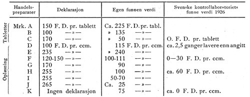 I nedstående tabell har jeg sammenstillet: A. Den i deklarasjonen angitte styrke. B. Den funne verdi. C. De av Apotekernes kontrollaboratorium i Stockholm i 1926 funne verdier hvor disse foreligger.