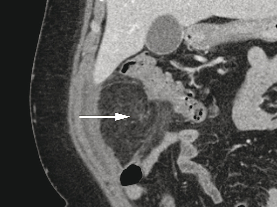 En kvinne i 40-årene ble innlagt med magesmerter, mest uttalt under høyre kostalbue. Smertene var konstante og hadde oppstått tre dager tidligere. Hun var ikke tidligere operert i buken. Ved klinisk undersøkelse var abdomen bløt med palpasjonsømhet i øvre høyre kvadrant. Bortsett fra forhøyet CRP på 80 mg/l (< 5) var alle blodprøver normale. Ultralydundersøkelse av lever, galleblære og pancreas ved innkomst viste upåfallende forhold. På grunn av vedværende sterke smerter ble pasienten undersøkt med CT abdomen samme dag. CT-undersøkelsen viste et avkapslet område av mesenterialt fettvev ventralt i øvre høyre kvadrant. I koronalplan (bilde til venstre) indikerer pilen det avkapslede området. I sagittalplan (bilde til høyre) så man tydelig en spiralformet forandring, som kunne representere roterte kar og mesenteriale strukturer (pil). Pasienten ble laparoskopert og det ble funnet en partiell torsjon av omentum majus. Det torkverte segment lå adherent mot bukveggen og inneholdt begynnende nekrotiske forandringer og ble fjernet.