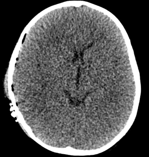 I akuttmottaket åpnet han så vidt øynene på sterke smertestimuli, laget kun enkelte lyder og hadde målrettede avvergebevegelser, dvs. Glasgow Coma Score 9 (pediatrisk GCS-versjon). Etter en rask klinisk undersøkelse ble det utført CT-undersøkelse av hodet. Den viste et stort epiduralt hematom på høyre side, med masseeffekt og midtlinjeoverskyting (bildet til venstre). Man så også det som blir kalt «swirl sign», som indikerer en pågående og kraftig blødning (grønn pil) (2) . På vital indikasjon ble han tatt direkte til Nevrokirurgisk operasjonsstue, der det ble gjort en kraniotomi med evakuering av hematomet. Ny CT-undersøkelse av hodet dagen etter viste pene postoperative forhold (bildet til høyre).