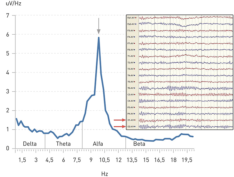 Med fremveksten av moderne datamaskiner ble frekvensanalyse basert på FFT (fast fourier transformation) utforsket i psykiatri og nevrologi (9, 10). Frekvensanalysen gir oss tallverdier for mengden delta-, theta-, alfa- og betaaktivitet og fordelingen kan fremstilles i et xy(frekvens/mengde)-diagram (fig 1). Frekvensanalyse (QEEG) er innebygd i mange av de kommersielle EEG-systemene som er i bruk i Norge i dag. Ukvalifisert overforbruk av QEEG i klinisk virksomhet på 1990-tallet ble kritisert av den amerikanske nevrologiforeningen som fastslo at QEEG alltid måtte benyttes sammen med vanlig EEG tolket av nevrofysiolog (6). Bakgrunnen for dette er at det finnes mange feilkilder som må elimineres før man kan stole på at QEEG-analysen gir riktig resultat. QEEG er imidlertid et nyttig forskningsverktøy. Med utviklingen av analyseprogrammer med brukervennlig grensesnitt og større dataprosessorer er nå forskning på QEEG ved psykiatriske tilstander i rask fremvekst (7).