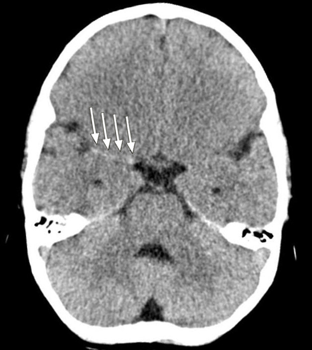 Et barn ble innlagt med en nyoppstått venstresidig hemiparese. CT caput ved innkomst viste «tett media-tegn» (dense media sign) (piler), noe som ga mistanke om en langstrakt trombe i høyre a. cerebri media (bildet til venstre). Pasienten fikk gradvis fallende bevissthetsnivå, og det ble gjort MR-undersøkelse. Denne viste nedsatt diffusjon som tegn på ferskt infarkt i hele forsyningsområdet til a. cerebri media samt begynnende ødem (bildet til høyre).