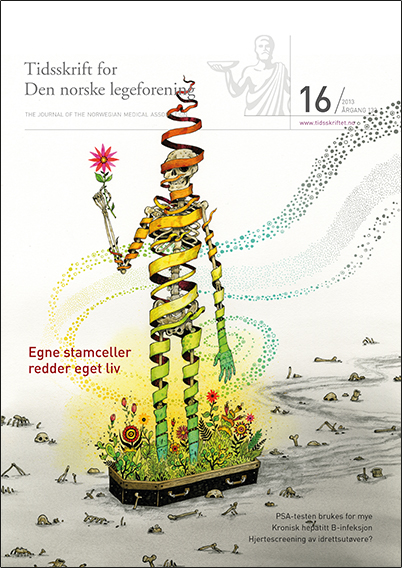 Forsidebildet FORSIDEN () sporsmal_grey_rgb Artikkel Illustrasjon © John Hendrix Lymfom er en livstruende sykdom. Høydosebehandlingen av lymfom er så effektiv at den i seg selv kan ta livet av pasienten. Stamcellestøtten gir livet tilbake. Med død kan døden beseires. Kommentarer ( 0 ) Dette kommentarfeltet modereres, men kommentarer blir ikke redaksjonelt behandlet ut over å sikre at de følger retningslinjer for vårt kommentarfelt. Denne artikkelen ble publisert for mer enn 12 måneder siden, og vi har derfor stengt for nye kommentarer. Publisert: 3. september 2013 Utgave 16, 3. september 2013 Tidsskr Nor Legeforen 3. september 2013 133 : 1675 Publisert: 3. september 2013 Utgave 16, 3. september 2013 Tidsskr Nor Legeforen 2013 133 : 1675 PDF Får du ikke vist PDF-filen eller vil lagre filen, kan du høyreklikke på PDF-ikonet. Velg «Lagre mål/fil som..» og hent så opp PDF-filen i for eksempel Acrobat Reader. Skriv ut Anbefalte artikler