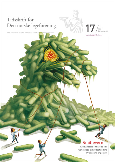 Forsidebildet FORSIDEN () sporsmal_grey_rgb Artikkel Illustrasjon © Christopher Buzelli Det var i en petriskål med Staphylococcus aureus at Alexander Fleming oppdaget penicillinets antibakterielle effekt. Noen få tiår senere var de fleste S. aureus på sykehus resistente. I Europa dør nå flere av resistente bakterier enn av ulykker. I kampen mot en så liten fiende blir vi fortsatt små. Kommentarer ( 1 ) Dette kommentarfeltet modereres, men kommentarer blir ikke redaksjonelt behandlet ut over å sikre at de følger retningslinjer for vårt kommentarfelt. Forsidebildet Truls Leegaard Truls Leegaard Stilling Avd. mikrobiologi og smittevern tlee@ahus.no Interessekonflikt: Nei Om forfatteren 13.09.2016: Hei. Lurte på om det var mulig å få tak i illustrasjonen? Hva må jeg eventuelt gjøre? Med vennlig hilsen Truls Leegaard Denne artikkelen ble publisert for mer enn 12 måneder siden, og vi har derfor stengt for nye kommentarer. Publisert: 17. september 2013 Utgave 17, 17. september 2013 Tidsskr Nor Legeforen 17. september 2013 133 : 1787 Publisert: 17. september 2013 Utgave 17, 17. september 2013 Tidsskr Nor Legeforen 2013 133 : 1787 PDF Får du ikke vist PDF-filen eller vil lagre filen, kan du høyreklikke på PDF-ikonet. Velg «Lagre mål/fil som..» og hent så opp PDF-filen i for eksempel Acrobat Reader. Skriv ut Anbefalte artikler