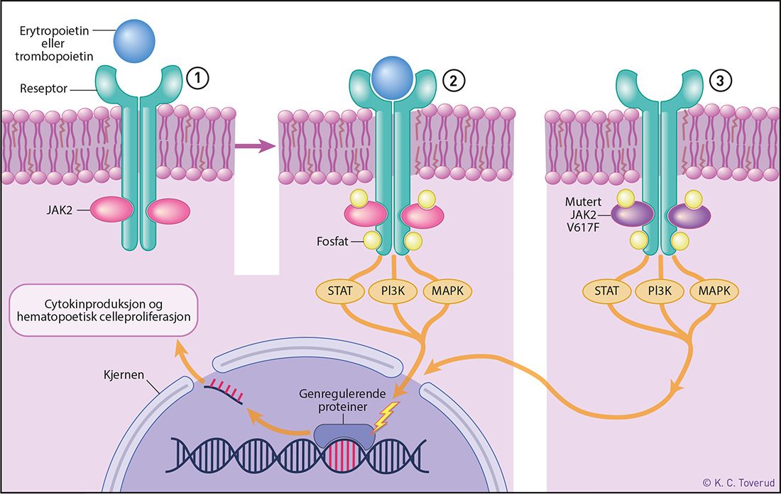 De sykdomsinitierende genmutasjonene ved primær myelofibrose er ukjente, men 50 – 60 % av pasientene har mutasjonen JAK2 V617F (3). Mutasjonen kan også påvises ved polycythemia vera (over 90 %) og essensiell trombocytose (ca. 60 %). Omtrent 10 % av pasientene med primær myelofibrose har mutasjon i MPL W515/L-genet (myeloproliferativ leukemi virus onkogen/trombopoietin-reseptor) (3). Andre mutasjoner er sjeldnere, er ikke sykdomsspesifikke og brukes ikke rutinemessig i diagnostikken (4). JAK2- og MPL-mutasjoner gir økt signalering via JAK-STAT-signalveien (STAT = signaltransduser og aktivator av transkripsjon), se figur 1 (4). Dette fører til myeloproliferasjon og en sekundær inflammasjon som medfører forstyrret cytokinproduksjon, inkludert frisetting av vekstfaktorer som stimulerer fibroblastene og medfører lokal fibrose og senere osteosklerose og beinmargssvikt som sluttresultat. Dette kalles primær beinmargsfibrose fordi den utløses av en primær malign beinmargssykdom; dette er i motsetning til sekundær beinmargsfibrose som utløses av medikamenter som trombopoietinreseptoragonister (5), autoimmune sykdommer eller maligniteter (6).