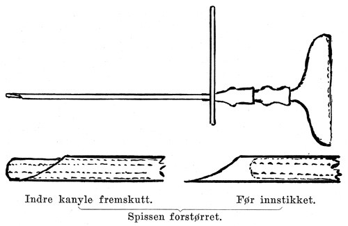 Kanylen, som er meget enkel å behandle, fabrikeres i 3 gjengse størrelser og fåes hos Andreas Ruuds eftf., Pilestredet, Oslo.