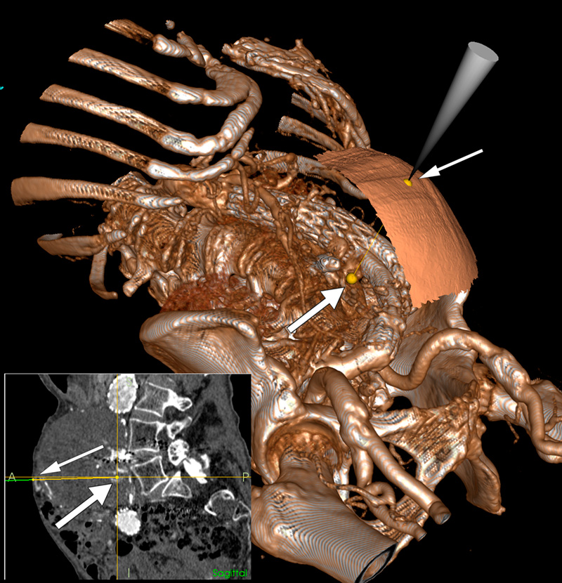Nasjonalt kompetansesenter for ultralyd og bildeveiledet behandling har utviklet et navigasjonssystem (1) som kontinuerlig viser posisjonen til forskjellige instrumenter i et 3D-bilde. I en gjennomlysningsstue med integrert 3D-avbildningsutstyr kunne det ved hjelp av navigasjonssystemet utføres perkutan embolisering uten å måtte flytte pasienten. Stor figur viser et 3D-bilde av pasienten med nåletuppens plassering på hudoverflaten (tynn pil) og retning mot en av lumbalarteriene (tykk pil). Slik kan nålen plasseres optimalt og posisjonen kontrolleres underveis med mulighet for flere innstikk basert på samme bildeopptak. Liten figur viser samme oppsett i sagittalplanet. Mikrokateteret ble anlagt via nålen og lumbalarteriene embolisert med Onyx-injeksjoner. Kontroll halvannet år senere viste ingen lekkasje og uendret størrelse på aneurismet. Metoden er eksperimentell og del av et pågående forskningsprosjekt.