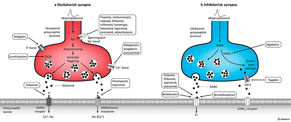 GABAerg nevrotransmisjon kan påvirkes på flere måter. For eksempel vil barbiturater og benzodiazepiner, som fortsatt er helt sentrale medikamenter i behandling av epilepsi, ikke minst som anfallskuperende behandling ved anfallsserier og status epilepticus, hovedsakelig virke ved å påvirke selve GABAA-reseptoren (14). Begge preparatene fører til økt kloridinnstrømming, men virkningsmekanismen er likevel noe forskjellig. Mens barbituratene ser ut til å binde seg til et eget bindingssted, noe som fører til at den aktiverte GABA-kanalen holdes åpen lenger, binder benzodiazepinene seg til et modulatorisk bindingssted og øker frekvensen av kanalåpningene. Sluttresultatet blir det samme – økt total kloridinnstrømming (15).