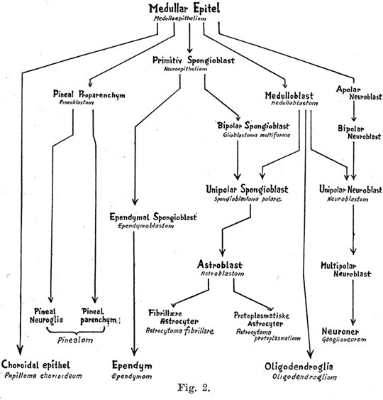 I centralnervesystemet finnes der et stort antall forskjellige celleformer. Disse kan som bekjent deles inn i to hovedgrupper: 1. Nevroner. 2. Nevroglia. Disse celler stammer alle fra det føtale medullær-epitel. Fra dette epitel begynner tidlig i fosterlivet forskjellige celleformer å utdifferensiere sig. De viktigste av disse er nevroblastene, som skal utvikle sig til de ferdige nevroner, spongioblastene og medulloblastene. Disse former utvikler sig så videre. Nevroblastene gjennemløper forskjellige stadier og blir til nevroner, se fig 2. Fra medulloblastene utvikles dels celler kjent under navnet oligodendroglia, dels astrocyter. Spongioblastene utvikler sig gjennem flere mellemformer til astrocyter, hvorav der finnes to typer, de fibrillære og de protoplasmatiske, dels til ependymceller o.s.v. De mange navn er egnet til å skape forvirring, jeg nevner dem bare for å lette forståelsen av de betegnelser som de forskjellige gliomformer har fått.