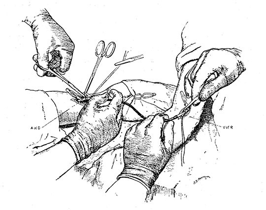 Man tar blodet bedst fra radialarterien og fører det over i en av patientens albuvener eller i vena saphena. Lokalanæstesi, arterie og vene dissekeres ut. Der maa være to operatører, forat man ikke skal risikere smitteoverføring fra patienten til blodgiveren. Arterien maa blotlægges meget forsiktig og ikke beskadiges, da den ellers trækker sig sammen, og derved blir det vanskeligere at føre kanylen ind i arteriens lumen. Naar karret er blotlagt, lægges en ligatur ved den distale ende, og en liten arterieklemme lægges ved den proksimale ende. En V-formet incision gjøres derpaa med en meget skarp saks tæt ind til ligaturen; naar man saa trækker i denne, gaper aapningen i karret, og kanylen kan let føres ind. Man kan ogsaa fatte saarlappen med en fin tang, og indførselen av kanylen er endda lettere. Arteriekanylen sættes først ind. Arterieklemmen aapnes et øieblik, hvorved kanylen og tuben fyldes med blod og luften drives ut. Klemmen sættes atter paa, og venekanylen sættes ind. Begge arterieklemmer fjernes, og blodet flyter saa fra det friske individ til patienten.