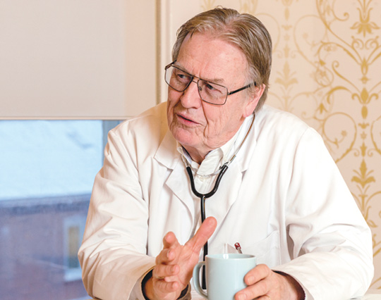Han er bekymret for rammebetingelsene rundt allmennpraksis, at legene i praksis blir så opptatt av bedriftsøkonomi at de slutter å stille faglige spørsmål. En ung turnuslege stikker hodet inn og nikker bekreftende.