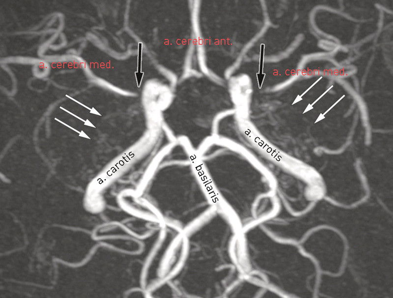Et barn i skolealder ble innlagt etter en episode med forbigående afasi og hemiparese. Det ble gjort MR av hodet med angiografisekvenser som viste innsnevring av øvre deler av begge arteria carotis interna. På MR-bildet så man at stenosen fortsatte videre og omfattet proksimale deler av a. cerebri media (svarte piler). Rundt de trange partiene så man mange, små kollaterale blodkar (hvite piler).
