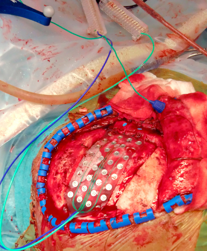 Bildene viser en peroperativ kartlegging av primærmotorisk hjernebark hos pasienten. Kartleggingen skjer med funksjonell MR (fMRi)-bilder og nevronavigasjon, somatosensorisk fremkalt respons (somatosensory evoked potential, SSEP) og elektromyografi (EMG). Målet med inngrepet var å anlegge permanente elektroder over relevante områder av primærmotorisk hjernebark for å lindre kroniske og medikamentelt intraktable smerter.