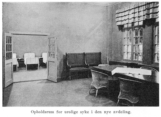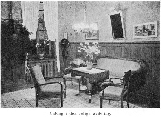 Den rolige avdeling har beholdt det preg, den hadde fra begynnelsen av : rummelige enkeltmanns værelser mot syd, koselige salonger og lyse korridorer, som alle ender i store verandaer, hvorfra patientene ha fri adgang til den vakre, uinnhegnede have og park. Det er kun det tekniske, som har måttet finne seg i å følge med de forandringer, som tiden har medført : oljefyring, elektrisk kokning, kjøleskaper. Og i salongene høittalere, som patientene setter overmåte pris på.