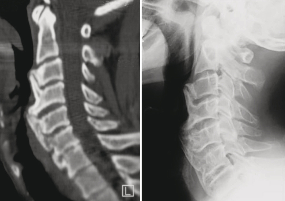 Illustrasjonen viser CT-bilde med rekonstruksjon. Det gir den beste fremstillingen av forandringene. Røntgen cervikalcolumna viser beinete påleiringer på halsvirvlene. Funksjonsbilder med bøy og strekk kan vise innskrenket bevegelighet.