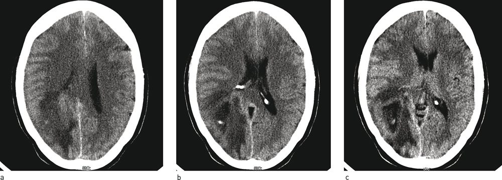 Den første CT-undersøkelsen ble gjort før innleggelse i sykehus og var etter standardprotokoll uten kontrast (fig 1). Undersøkelsen viste en lesjon der videre bildediagnostikk var nødvendig. Hvorfor det ikke umiddelbart ble utført CT-undersøkelse med kontrast av henvisende instans utenfor sykehuset da primærundersøkelsen viste tydelige forandringer, er uvisst. En slik undersøkelse ville ha fremskyndet diagnostiseringen og dermed behandlingen, som videre kunne ha endret prognosen. Ved CT-undersøkelse med kontrast vil abscesser oftest vise seg som ringoppladende lesjoner som et tegn på at blod-hjerne-barrieren er brutt og at det foregår en aktiv prosess rundt pusslommen. For å kunne skille abscesser fra andre intrakraniale romoppfyllende prosesser som høygradige maligne svulster er MR-undersøkelse med og uten kontrastserier, diffusjonsvektede sekvenser og spektroskopi en forutsetning for riktig diagnostikk (8).