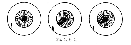 I et tilfælde (som er demonstreret i Oftalmologisk forening i Oslo 5te oktober 1927) blev iris trukket helt frem i sklerotomiaapningen (se fig. 2). I et andet tilfælde (fig. 3) blev iris sluppet straks den var trukket inn mellem ciliarlegemet og iris. I begge tilfælder har resultatet holdt sig godt. En tredje variation kan tænkes, idet man med en saks gjør et indklip i sfincterregionen for at hindre retraktion av iris.