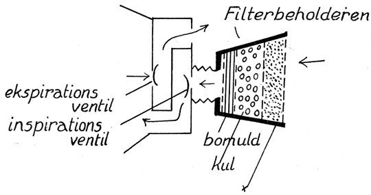 Opfinderen Fernez har konstruert en helt effektiv maske efter filtrationsmetoden med forskjellig aapning for inspirations- og ekspirationsluft ; filtret er beskyttet av en metallkapsel. Flg. tegning viser principet.