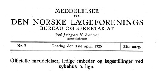 Annonsering av ledige legestillinger er en viktig oppgave for Tidsskriftet. Den første stillingsannonsen sto på trykk så tidlig som i nr. 3/1883, den gang det var få offentlige legestillinger. Vi presenterer her et lite utdrag av stillingsannonser fra 1925 (Tidsskr Nor Lægeforen 1925; 45: 393 – 4). Legg merke til likheter – og ulikheter – i lønns- og arbeidsvilkår.