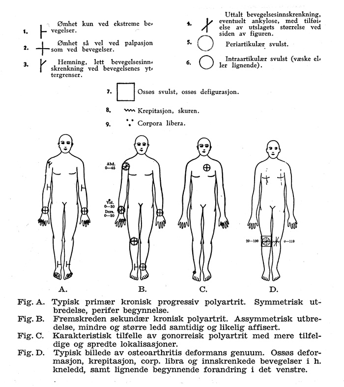 Avdøde dosent, dr. med. Jansen ved det fysikalsk-terapeutiske institutt ved Bispeberg hospital, København, har utarbeidet et praktisk og lettvint tegnsystem, som man finner offentliggjort i Acta Rheumatologica nr. 10, september 1931.